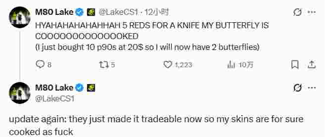 Lake:哈哈哈哈哈哈哈哈!5个红皮换一把刀,我的蝴蝶刀彻底凉透啦!