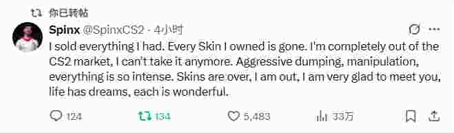 Spinx:我卖掉了所有东西。我拥有的每一个皮肤都没了。我彻底退出CS2市场了,再也承受不住了。疯狂抛售、市场操纵,一切都太离谱了。皮肤时代结束了,我退场了。很高兴能认识大家,人生各有梦想,每个都很精彩。