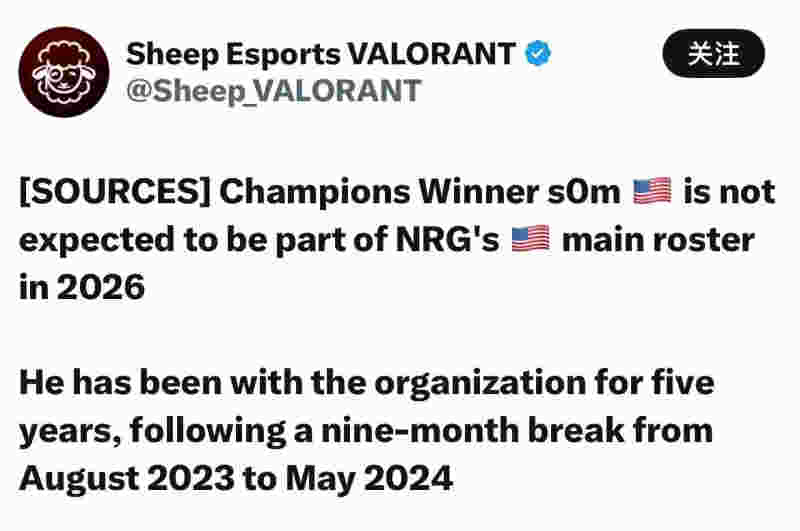 这名选手自2020年起效力NRG,中途在2023年8月至2024年5月短暂休息后回归,并随队夺得2025赛季巴黎无畏契约冠军赛冠军。