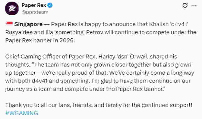 Paper Rex 很高兴地宣布,d4v41和something将在2026年继续在Paper Rex的旗帜下效力。