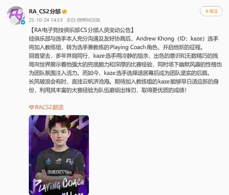 日前RA战队发布公告,表示队伍狙击手kaze将加入教练组,转为选手兼教练的Playing Coach角色,开启职业生涯新征程。