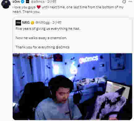 NRG官推也发文致谢:五年来他为我们奉献了他的一切。如今他已是冠军。谢谢你所做的一切s0m。