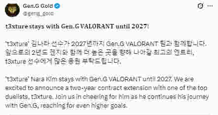 Kim Na-ra (김나라) | t3xture将与Gen.G并肩前行。Gen.G俱乐部发布的推文大意如下: