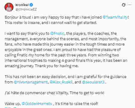 大家好(法语)!我很开心地宣布我加入VIT了!这阵容太厉害了,我真的等不及了。