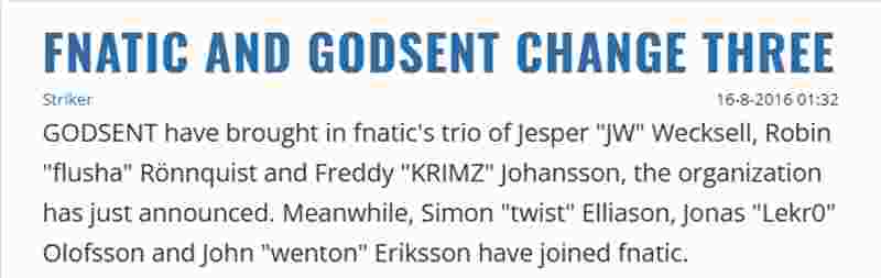 GODSENT,与老指挥pronax重逢(四人曾携手拿过3个Major冠军)。作为交换,fnatic从GODSENT换来twist和Lekr0,还签下了wenton。