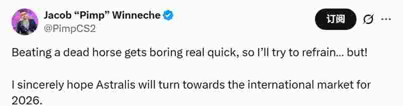 这场对决结束后,丹麦电竞评论员Pimp在平台发文表示,他由衷希望Astralis能在2026年将目光投向国际选手市场。