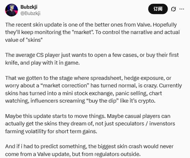 如果让我预测,皮肤市场最大的崩盘绝不会来自Valve的更新,而是来自外部监管机构的介入。”