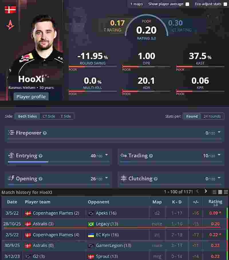 而在图二Nuke上,Astralis全场只拿到了3分,被Legacy轻松击溃。Astralis战队指挥HooXi在Nuke上发挥惨淡,他只有0.20的rating,1-16的K/D,ADR低至20.1,RS值也是惊人的-11.95%。