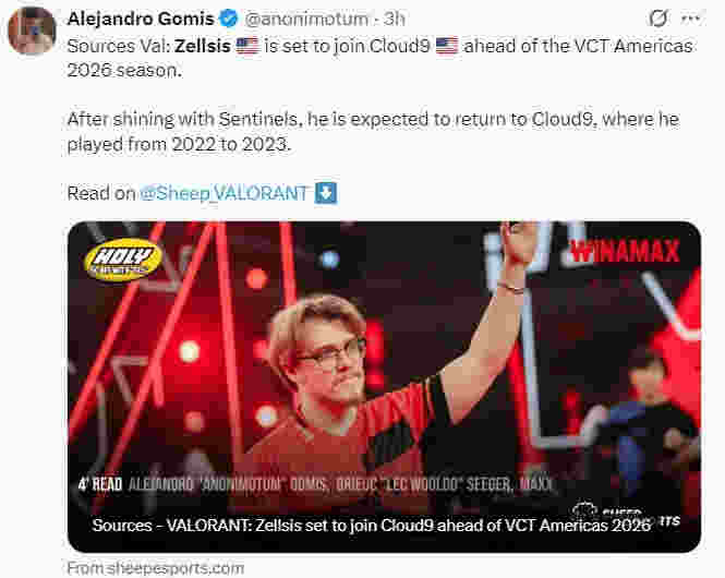 Zellsis将在2026年VCT美洲赛季开始前加入C9。