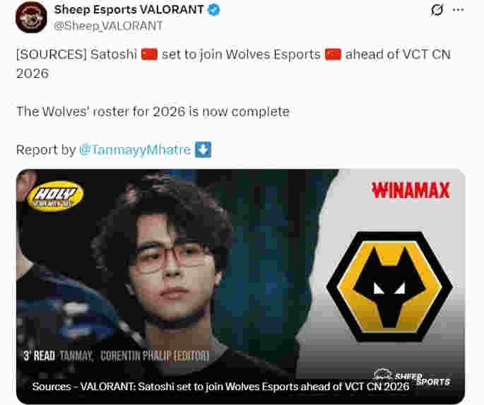 Satoshi将在2026年VCT CN赛季开始前加入狼队,狼队2026年的名单现已完成。
