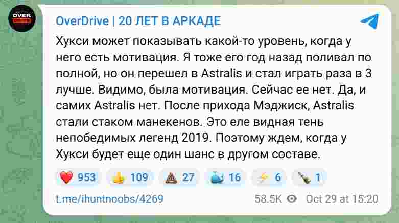 现在,这份动力消失了。而且Astralis这支队伍本身也不复往日风采。自从Magisk加入后,整支队伍就像一堆人偶堆砌物,只剩下2019年那支不可战胜的传奇之师的微弱影子。所以,我们只能期待HooXi能在其他战队获得新的机会了。”