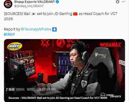 外媒爆料:前BLG教练bail将加入JDG担任VCT 2026的主教练。