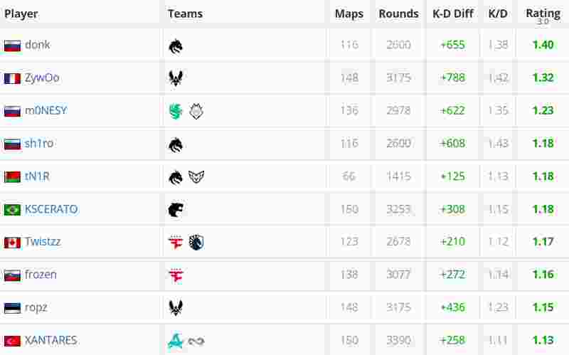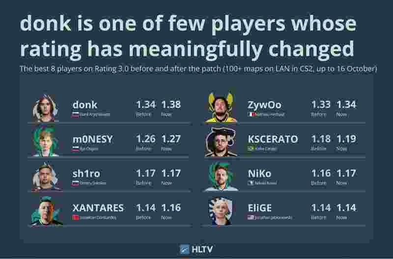 HLTV已优化CS2中的Rating计算公式。受此影响,部分选手的Rating数据出现上涨,其中donk的Rating涨幅最大:在过去100场比赛中,他的Rating提升了0.04。