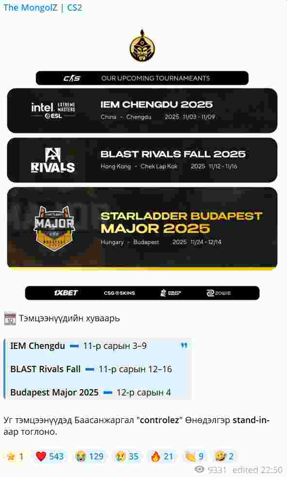 此前有消息称,controlez将随The MongolZ征战2025年IEM 成都站,如今参赛赛事名单进一步扩大:除成都站之外,他还将以替补身份代表队伍出战2025年BLAST 巅峰赛S2及2025年StarLadder 布达佩斯Major。