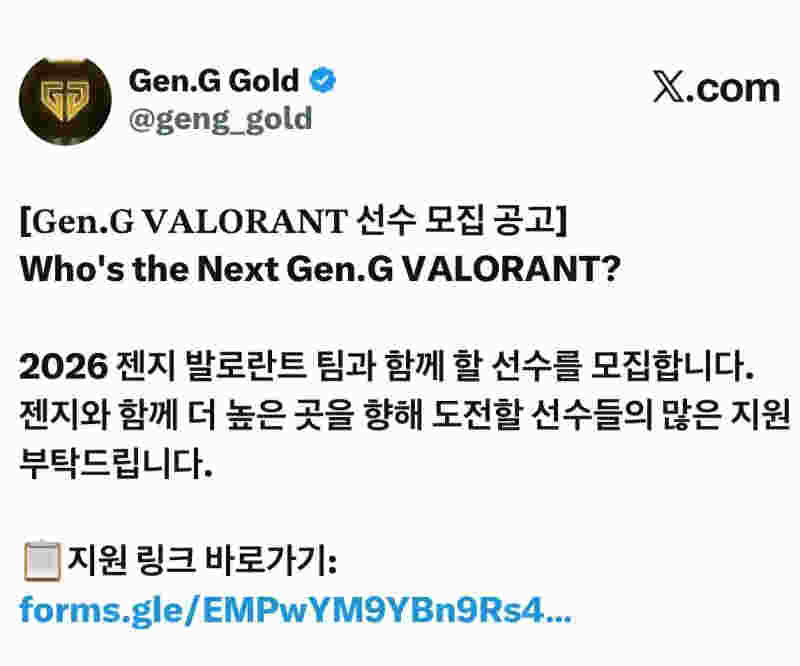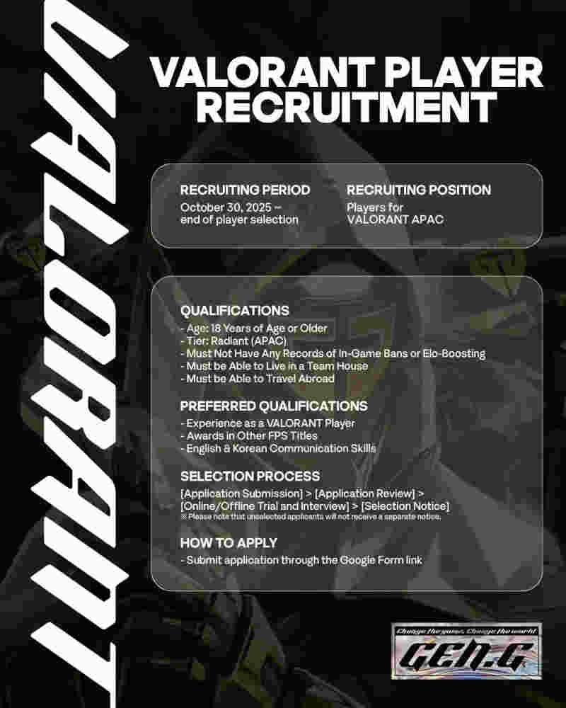 Gen.G今日正式发布《无畏契约选手招募公告》,面向亚太地区开放选手申请。