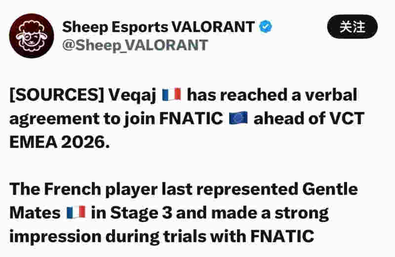 FNATIC达成口头加盟协议,预计将随队征战2026赛季VCT EMEA联赛。