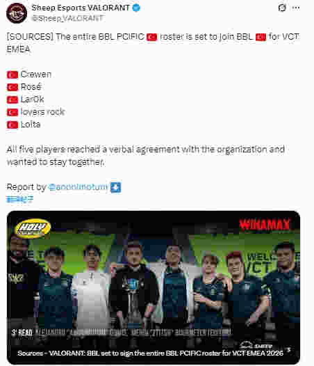 根据外媒爆料,今年EMEA晋升赛晋级队伍土耳其战队BCF所有选手将加入 BBL Esports,征战明年VCT EMEA联赛。