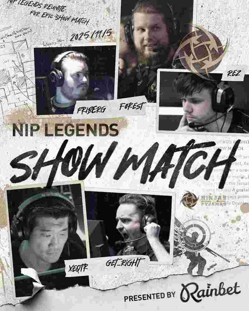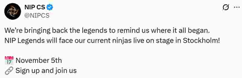 NIP的传奇选手们将作为表演赛的一部分回归。NIP宣布了一场有该队传奇选手参加的表演赛。参赛名单包括GeT_RiGhT、f0rest、friberg、REZ以及曾在CS 1.6时期为这家瑞典俱乐部效力的42岁的Xeqtr。