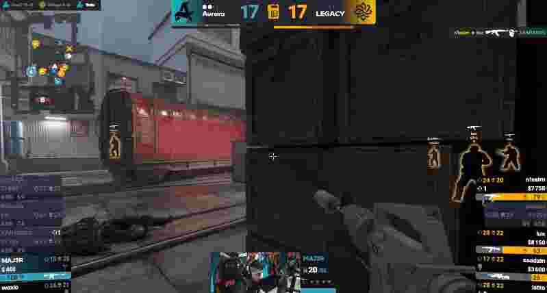 图四,上半场的Aurora先作防守方开局,Legacy开局五人进攻B点双方人头互换3比3,最后latto残局一打二双枪连续两个颗秒拿下手枪局。