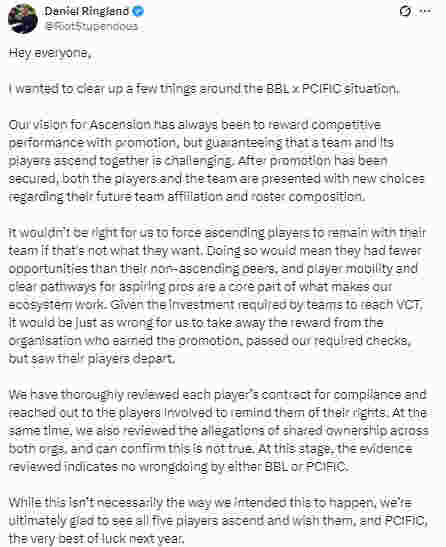 如果晋升的选手不愿留在原队,我们强迫他们留在原队是不合适的。这样做会让他们比其他未晋升的选手机会更少,而选手流动性和清晰的职业发展路径是我们生态系统运作的核心要素。考虑到战队晋升到VCT后所付出的投入,如果战队晋升到VCT后而选手却选择离开,我们剥夺掉他们的晋升奖励也是不合理的。