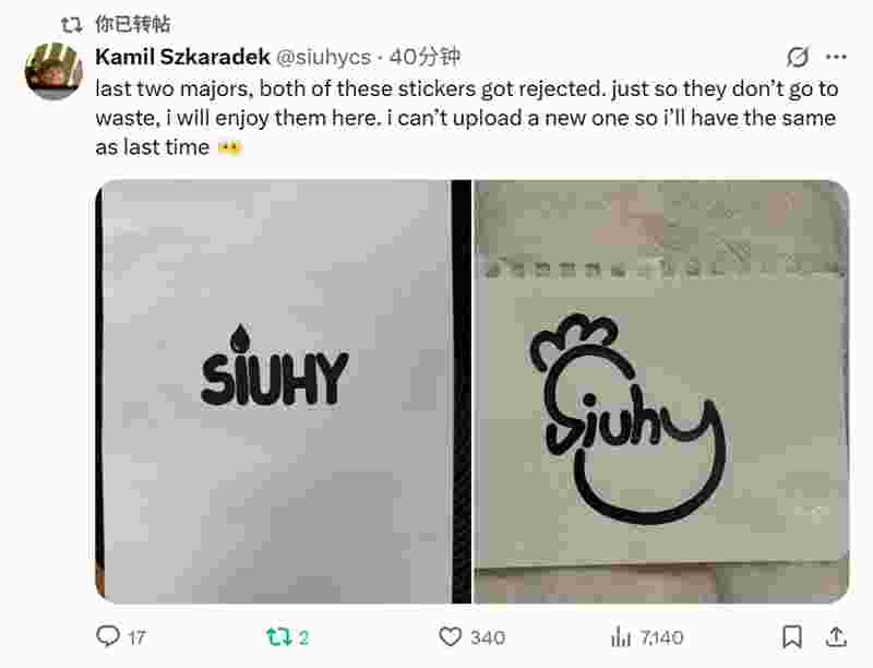 siuhy:过去的两个Major,这两个贴纸都被拒绝了。为了不浪费它们,我会在这里好好欣赏。我不能上传新的了,所以这次的签名贴纸会和上次的一样。