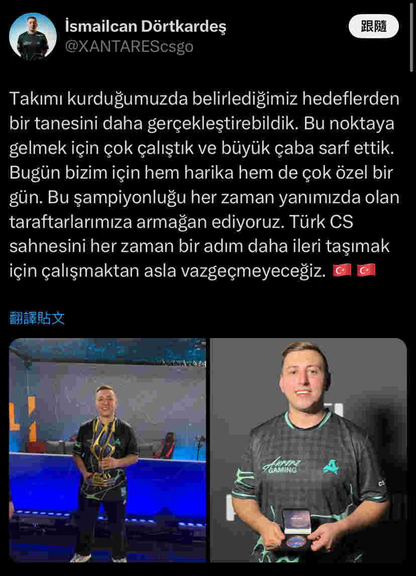XANTARES:我们实现了建队时设定的又一个目标。为了走到今天,我们付出了艰苦努力和巨大心血。今天对我们而言是美好而特别的一天。我们将这座冠军献给一直支持我们的粉丝们。我们永远不会停止为将土耳其CS推向新高度而努力。