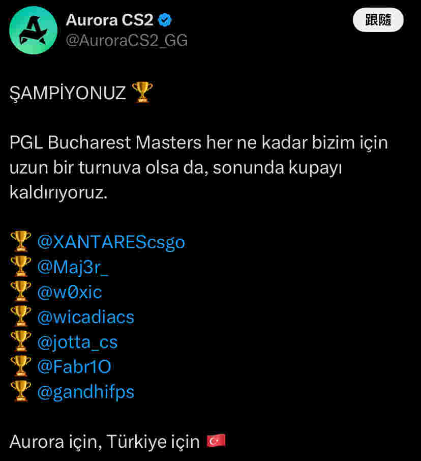 Aurora:我们是冠军!尽管PGL布加勒斯特大师赛对我们来说是一段漫长的赛程,但我们最终成功举起了奖杯。