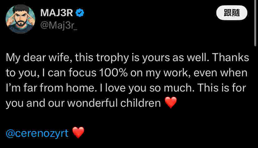 MAJ3R:我亲爱的老婆,这座奖杯同样属于你。正是因为有你在,即使我远在异乡也能百分之百专注于我的事业。我如此深爱着你。这份荣耀献给你和我们可爱的孩子们。