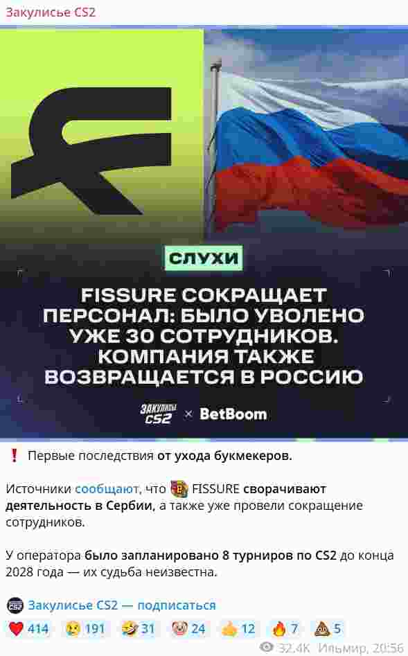 根据俄媒Закулисье CS2在社交平台上分享的消息,赛事主办方FISSURE已经开始了裁员工作,预计将会逐步停止在塞尔维亚的运营。