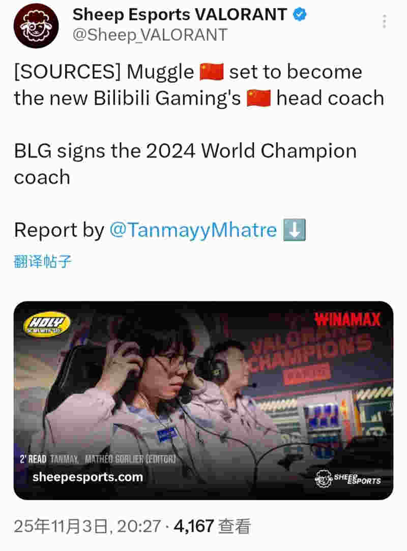 Bilibili Gaming担任主教练,BLG签下2024全球冠军赛冠军教练。