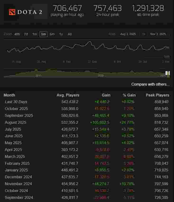 在十月,Dota 2的平均在线用户数为539,000人,而峰值在线用户数为859,000人。这些结果与八月的数据大致相当。然而,在九月,也就是The International 2025举行期间,这两个数字分别达到了581,000和954,000。
