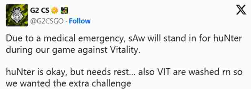 G2俱乐部发布声明,表示教练sAw将在G2对阵Vitality的比赛中顶替huNter-登场。