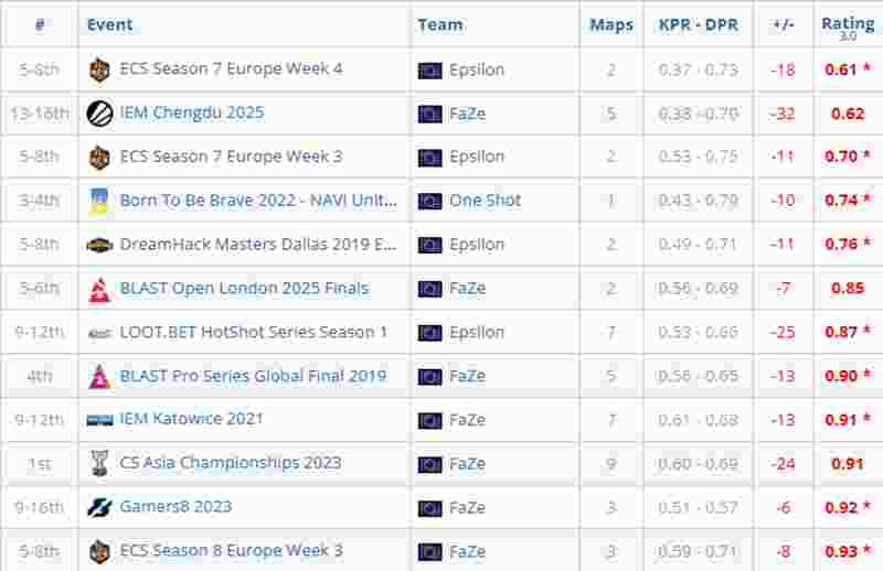 从赛后数据看,队伍狙击手broky表现不佳。他在本次赛事中的赛事rating仅为0.62,这一数据不仅是FaZe队内垫底的存在,同时也是他加入FaZe后职业生涯中最差的赛事rating数据。