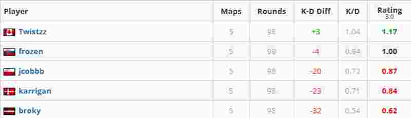 本次赛事中,FaZe除broky外发挥最差的是karrigan,为0.84rating。全队仅Twistzz一人数据为绿,为1.17rating。