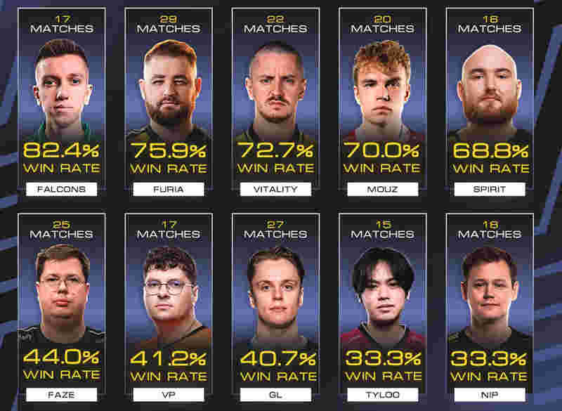 这份数据榜单清晰地展示了Falcons在近期的统治力。在m0NESY和NiKo的带领下,这支中东银河战舰不仅在IEM 成都站上表现出色,更在过去三个月的17场T1级别比赛中,取得了82.4%的惊人胜率。