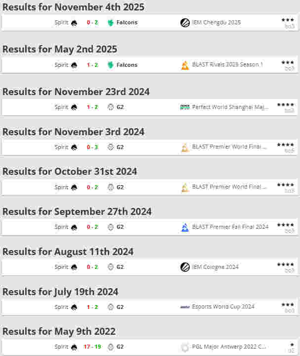 G2和Falcons期间对阵Spirit的全部9次交锋记录,全部保持了胜利。无论是BO1, BO3还是BO5,无论是donk的状态好坏,m0NESY所在的队伍都笑到了最后。