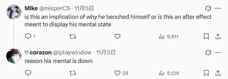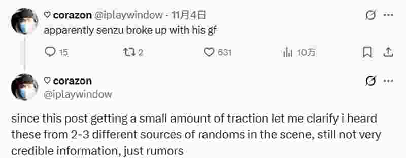 作为亚洲CS2新生代的核心人物之一,蒙古年轻天才选手Senzu再次成为焦点,此次并非因为赛场表现,而是社交媒体上流传的一系列传闻。社交平台用户@iplaywindow(昵称corazon)发文称“显然Senzu和女友分手了”。尽管他后来澄清该消息来自“圈内2-3个未经证实的消息源”,但这条帖子仍迅速获得超10万次浏览,在社区内引发大量调侃、梗图创作与讨论。