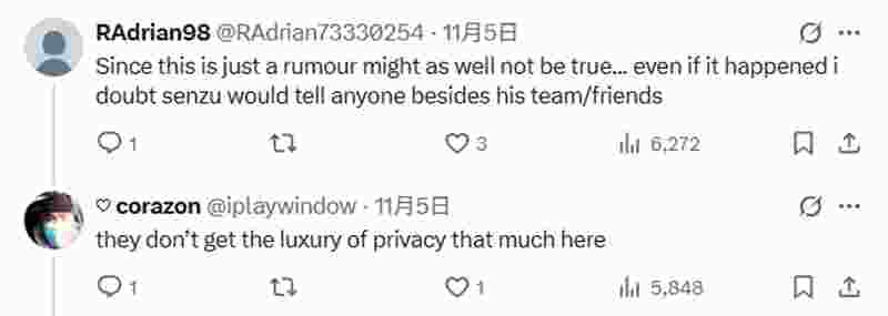 “就算是真的,我觉得Senzu也只会告诉队友或朋友,不会让外人知道。”