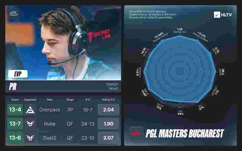 不过和队友一样,PR在半决赛对阵Aurora时表现不佳,且在季军赛对阵SAW的两张失利地图中状态下滑,这让他以微弱差距不敌Wicadia,无缘EVP榜首。