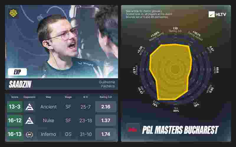 Legacy的狙击手,saadzin带领队伍一路闯入总决赛。他在获胜地图中的Rating达1.37,小组赛表现稳定(1.20 Rating),半决赛更是贡献关键发挥,Nuke加时赛23杀18死,Ancient地图25杀7死、Rating 2.16。