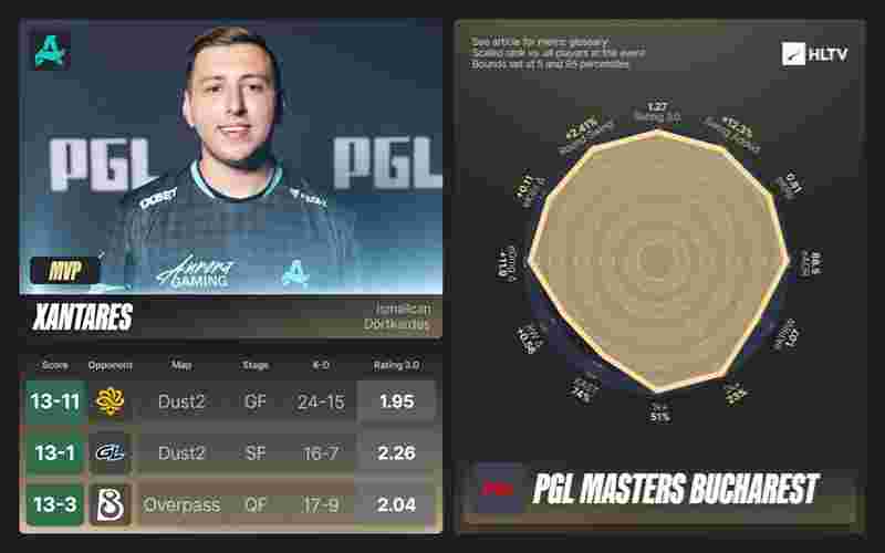 30岁的XANTARES在淘汰赛中打出了统治级的表现,以1.38的Rating、4张单图最佳选手的亮眼数据,毫无悬念地斩获个人首个线下赛事MVP,与冠军奖杯完美适配。