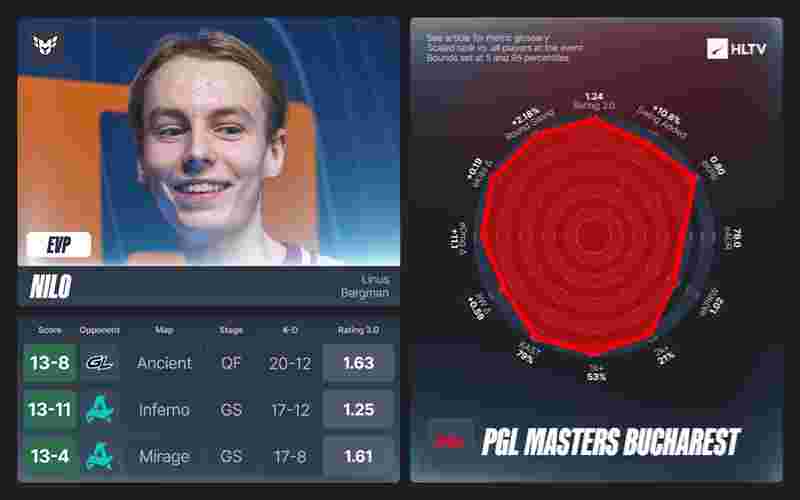 这是HEROIC 20岁新秀nilo职业生涯首次获得EVP奖项。他是队内对阵TOP20战队时表现最佳的选手(1.30 Rating),也是1/4决赛战队失利时唯一顽强抵抗的选手(1.26 Rating)。