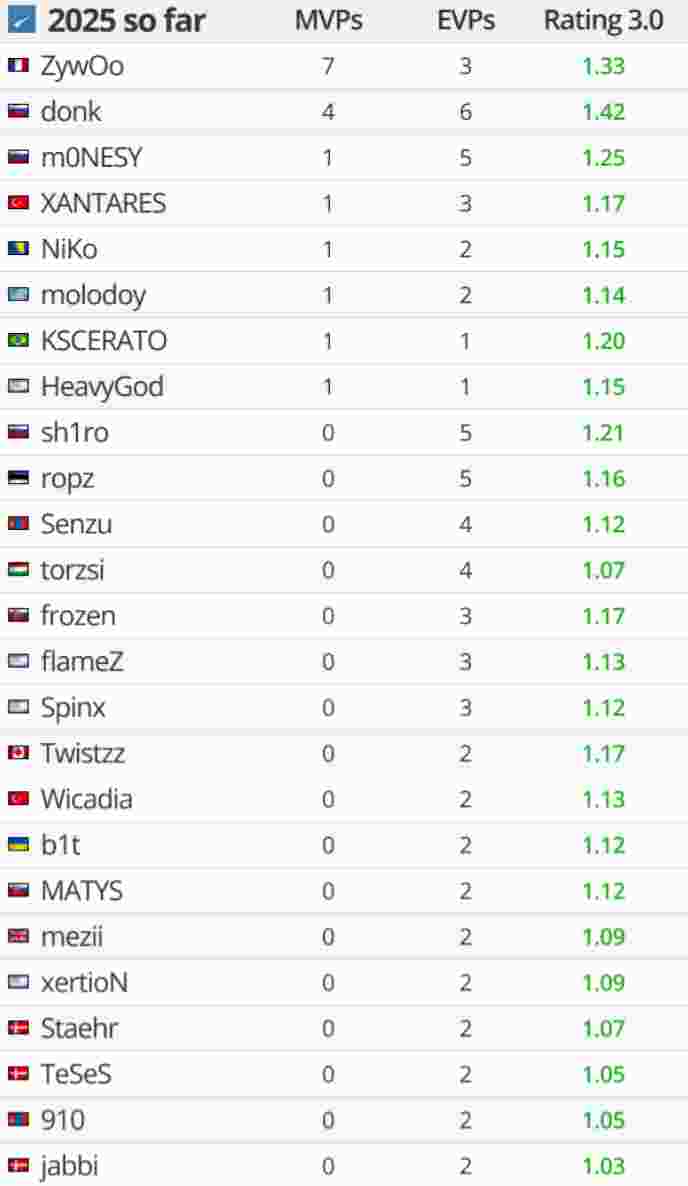 - Rating 3.0:HLTV综合rating,涵盖击杀、伤害、生存、KAST、多杀及回合影响力