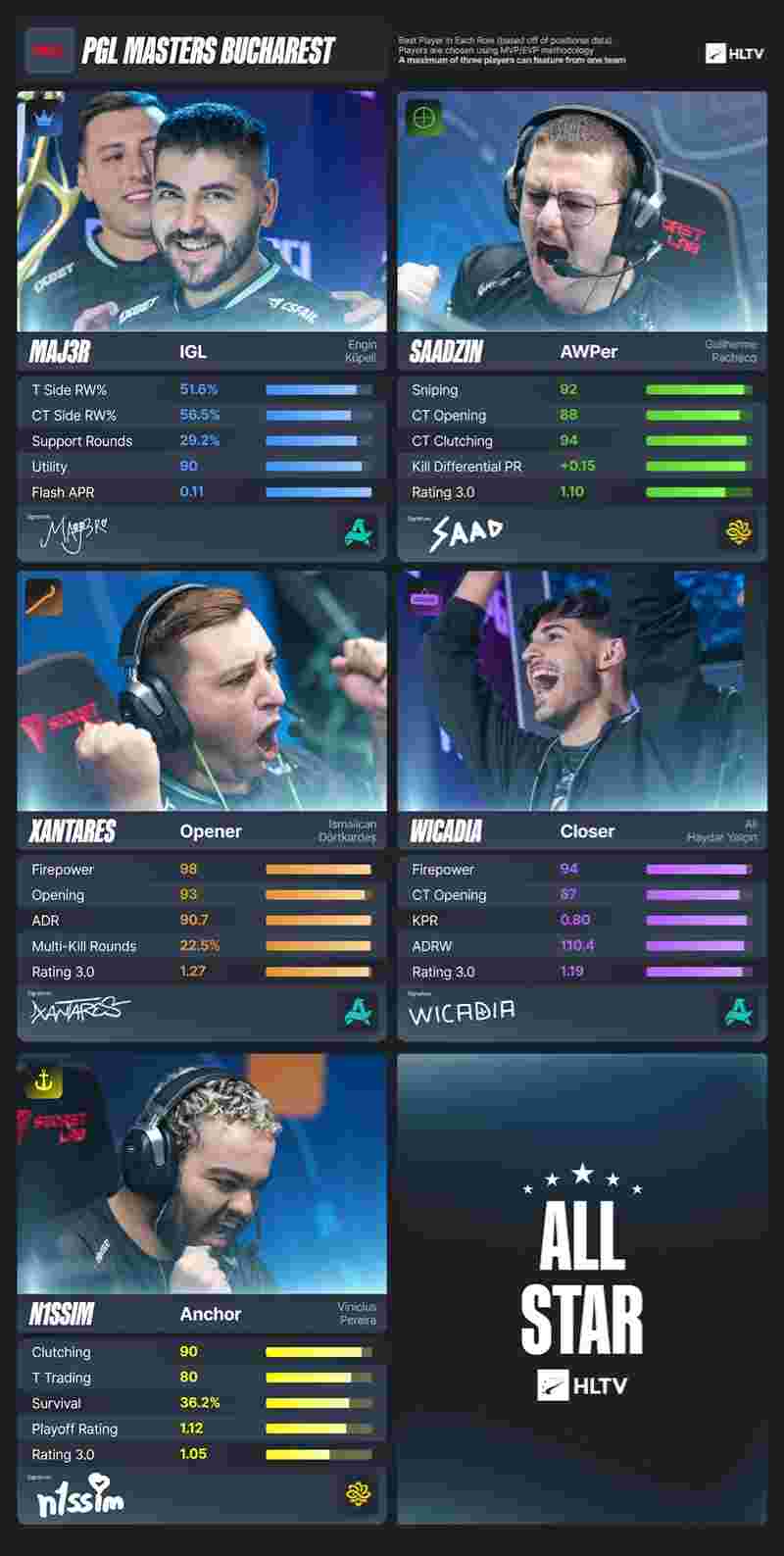 XANTARES是全明星阵容中毫无争议的人选,轻松锁定突破位。saadzin作为唯一入选EVP的狙击手,凭借获胜地图中的强势表现,击败story获得狙击位。