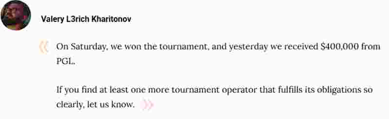“周六我们赢得了赛事冠军,昨天就已经收到了PGL发放的40万美元奖金。
