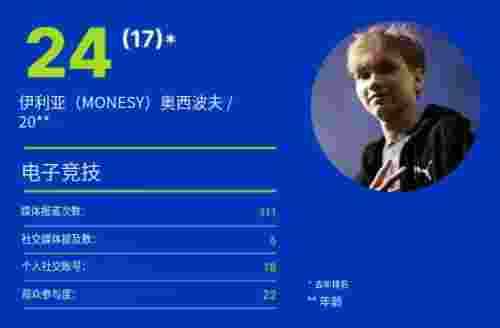 Falcons战队狙击手m0NESY入选俄罗斯运动员最具价值个人品牌榜单,位列第24名,超越两名泽尼特足球俱乐部球员及国际象棋大师扬·涅波姆尼亚奇。