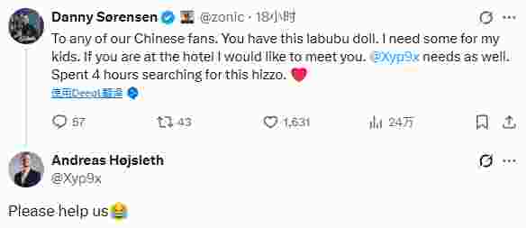 “致我们所有中国粉丝:你们有这款Labubu玩偶吗?我想给孩子们买一些。如果你们在酒店,我很想见见你们,Xyp9x也需要,我们已经花了4个小时找这玩意儿了。”