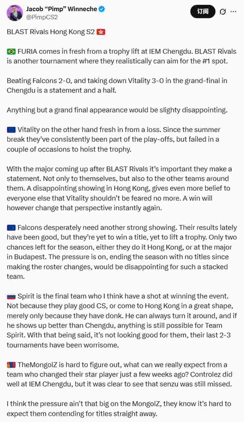 Pimp在社交平台上分享了自己对于BLAST 巅峰赛 S2参赛队伍的看法。