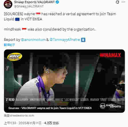 之前曾有爆料称mindfreak与wayne同时试训TL,但根据VCT外援限制规定,最终只有一人能留下。而根据最新爆料,TL选择了wayne。