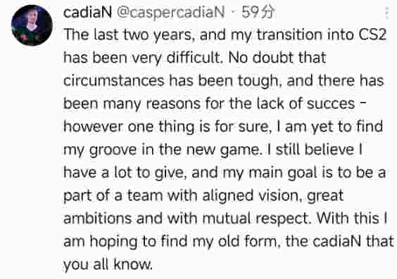 “过去两年,我向CS2转型的过程异常艰难。毫无疑问,处境一直很棘手,成绩不佳的原因有很多,但有一点是肯定的,我还没在这款新游戏里找到自己的节奏。我依然相信自己还有很多价值可以发挥,我的核心目标是加入一支愿景一致、野心勃勃且彼此尊重的队伍。希望借此,我能找回往日的状态,那个你们都熟悉的cadiaN。”